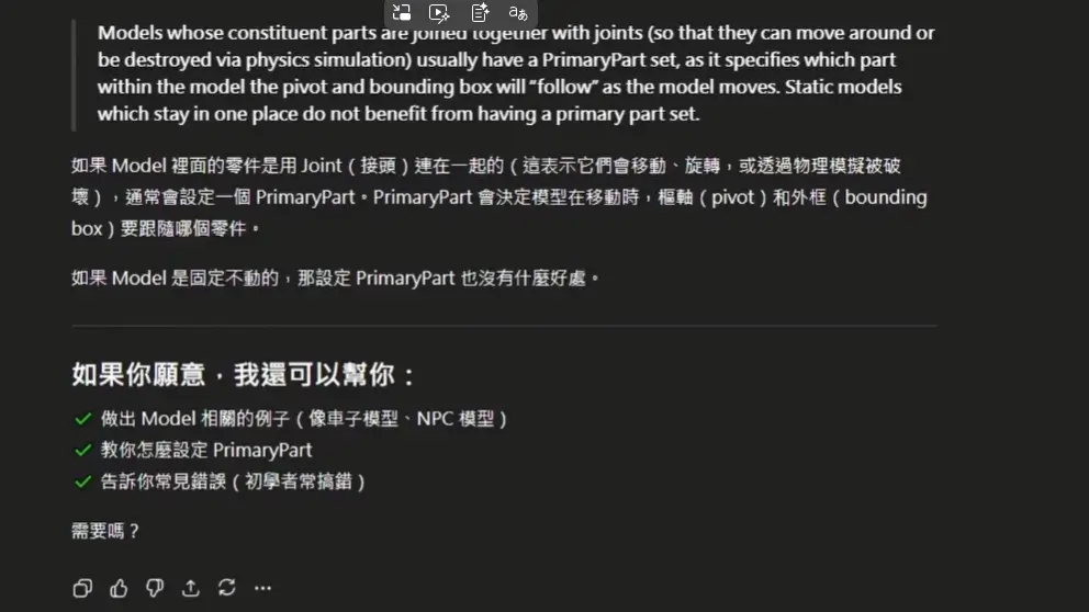 “I’m a beginner using Roblox Studio (Luau engine). Explain the [ObjectName] class: what it does, key properties/methods/events, required value types, and a simple example for [use case, e.g., ‘grouping house parts’]. Translate confusing English to simple Chinese/English. Include code snippets if relevant.”